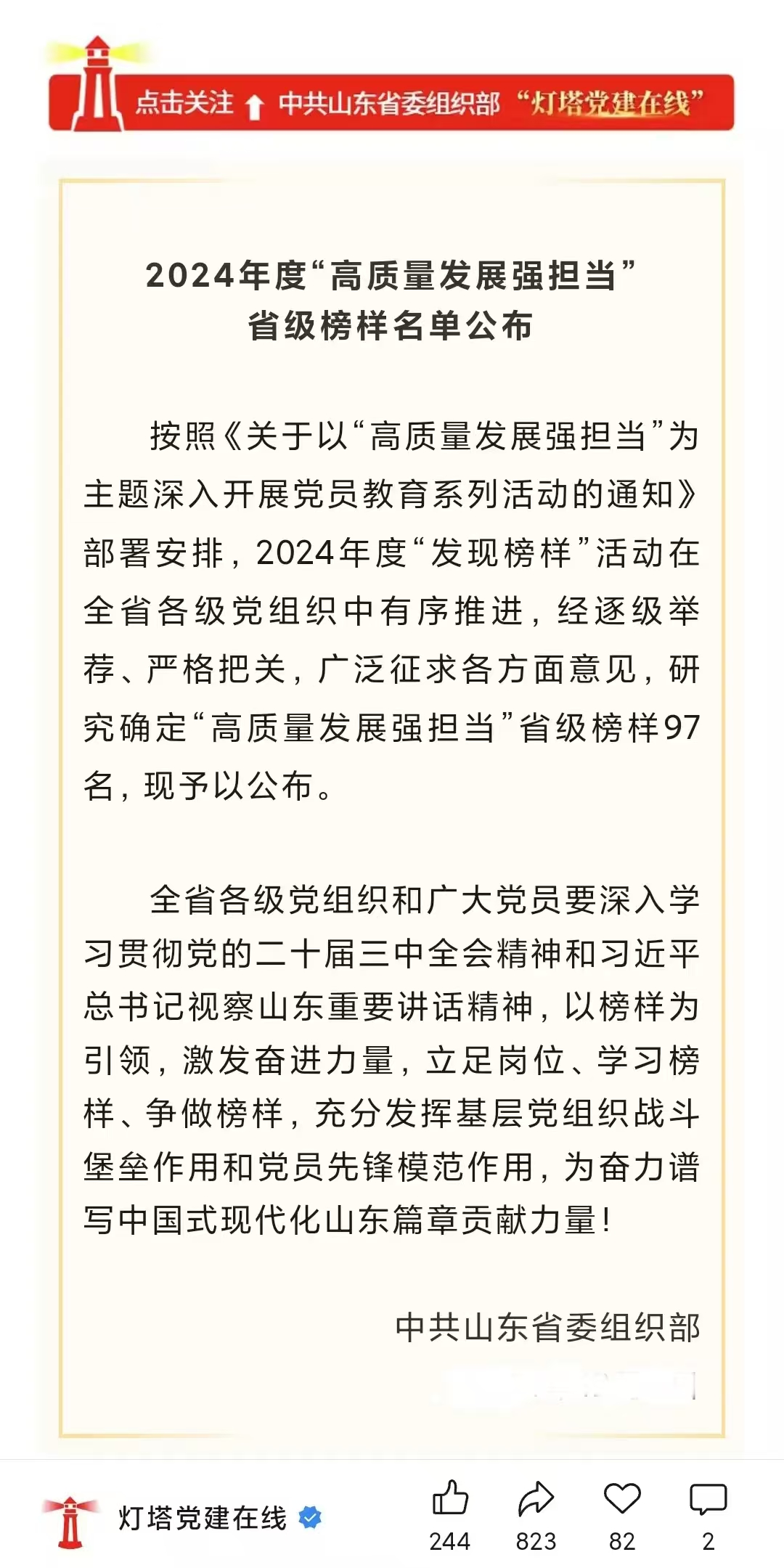 日前,泉兴水泥公司张宝民入选2024年度山东省委组织部“高质量发展强担当”省级榜样名单。他以坚定的信念、无私的奉献和非凡的担当,在平凡的岗位上书写着不平凡的篇章,为我们树立起熠熠生辉的标杆。