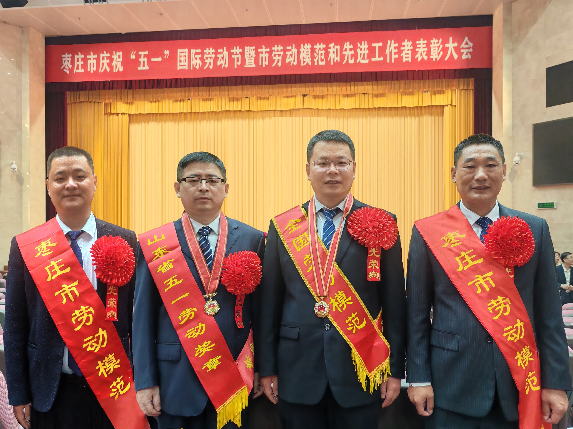 继泉兴水泥公司副总经理李修启荣获“全国劳动模范”称号之后,泉兴能源集团员工施红武荣获“山东省五一劳动奖章”,吴洪磊、杜玉柱荣获“枣庄市劳动模范”称号。从左至右:华沃(枣庄)水泥有限公司矿山工程师杜玉柱;南郊热电公司生产党支部书记、安全环保部主任施红武;山东泉兴水泥有限公司副总经理李修启;山东泉兴水泥